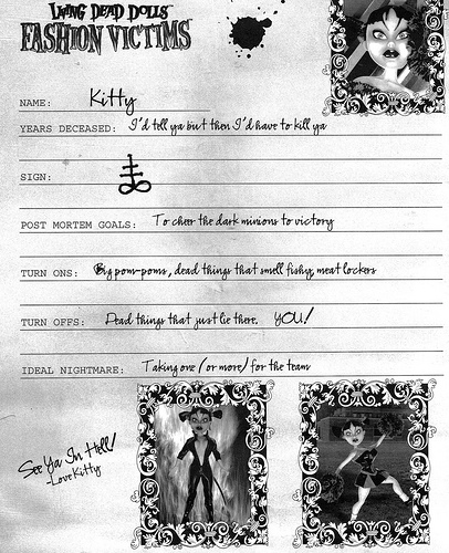 Szval, ismt a Living Dead Dolls kollekciban jrunk, a kedvenc Fashion Victims szriban, s akit ma megismerhettek, az Kitty.